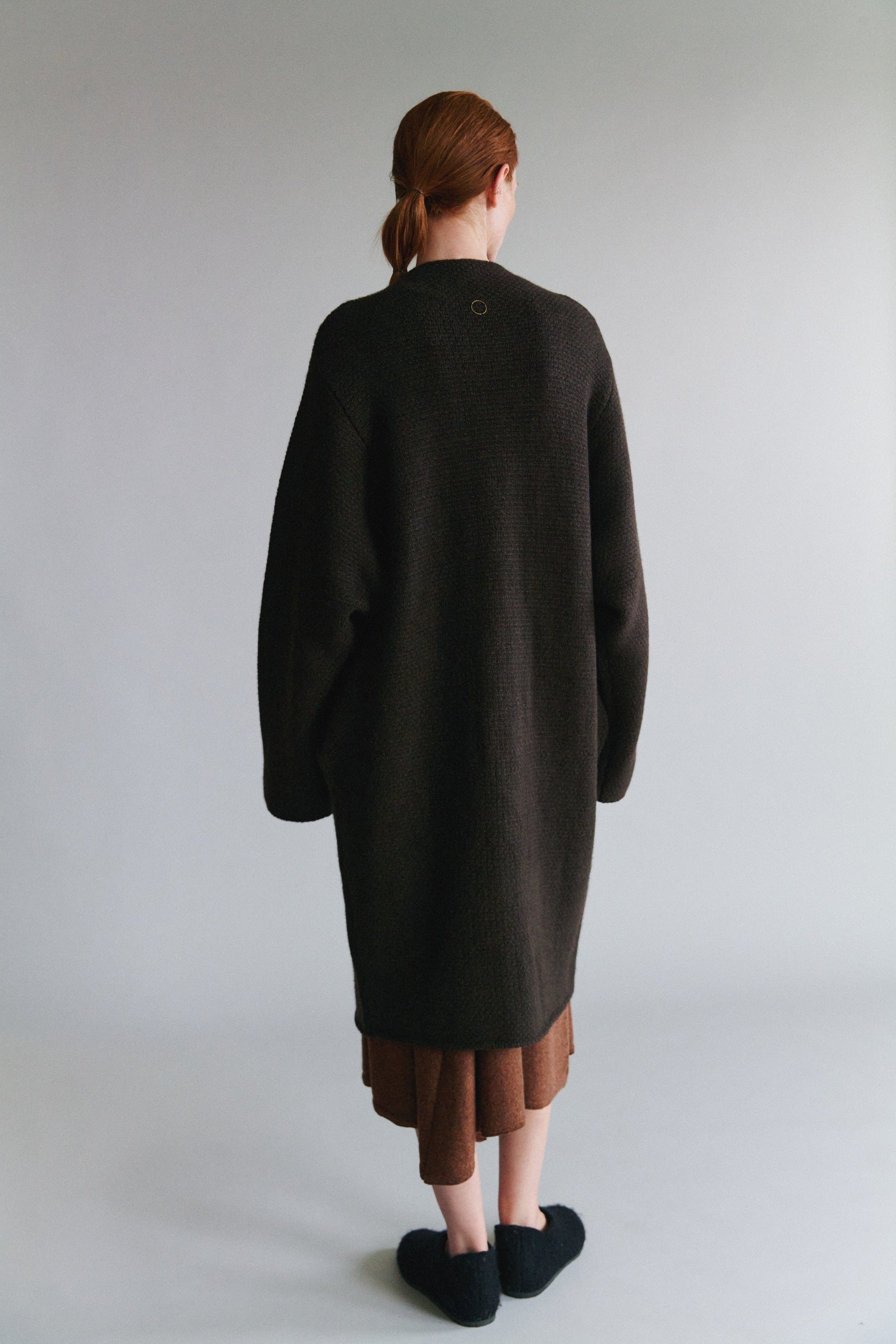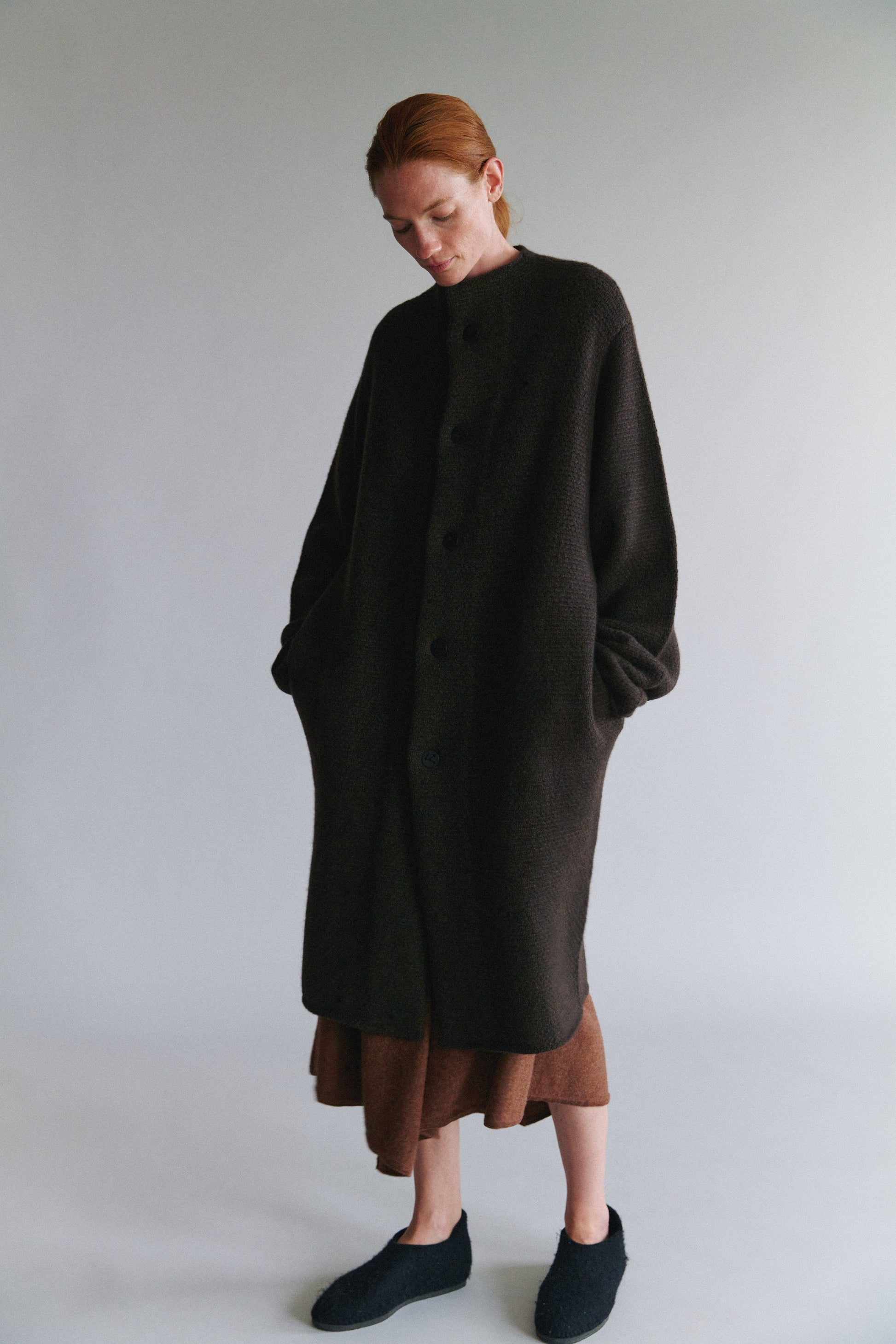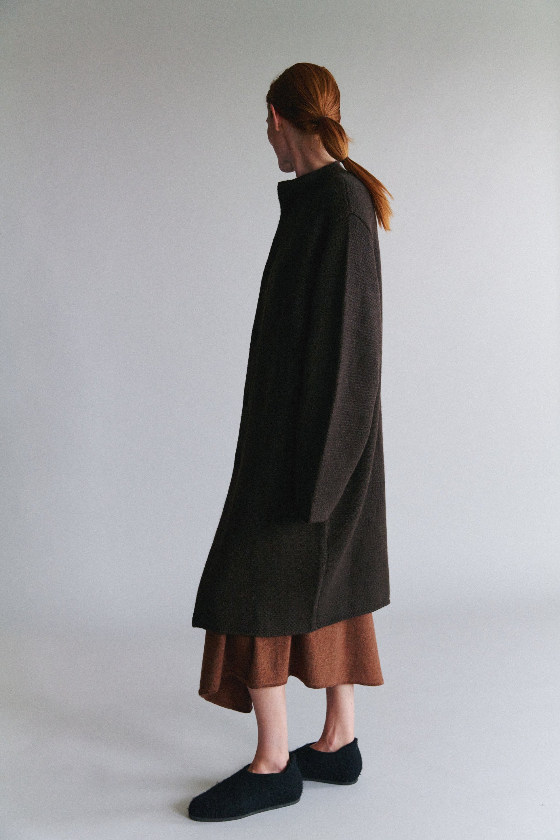 A rich textured chunky knit coat that falls just below the knees. Features dropped shoulders, side seam pockets, and a relaxed silhouette with oversized sleeves.100% Cashmere
