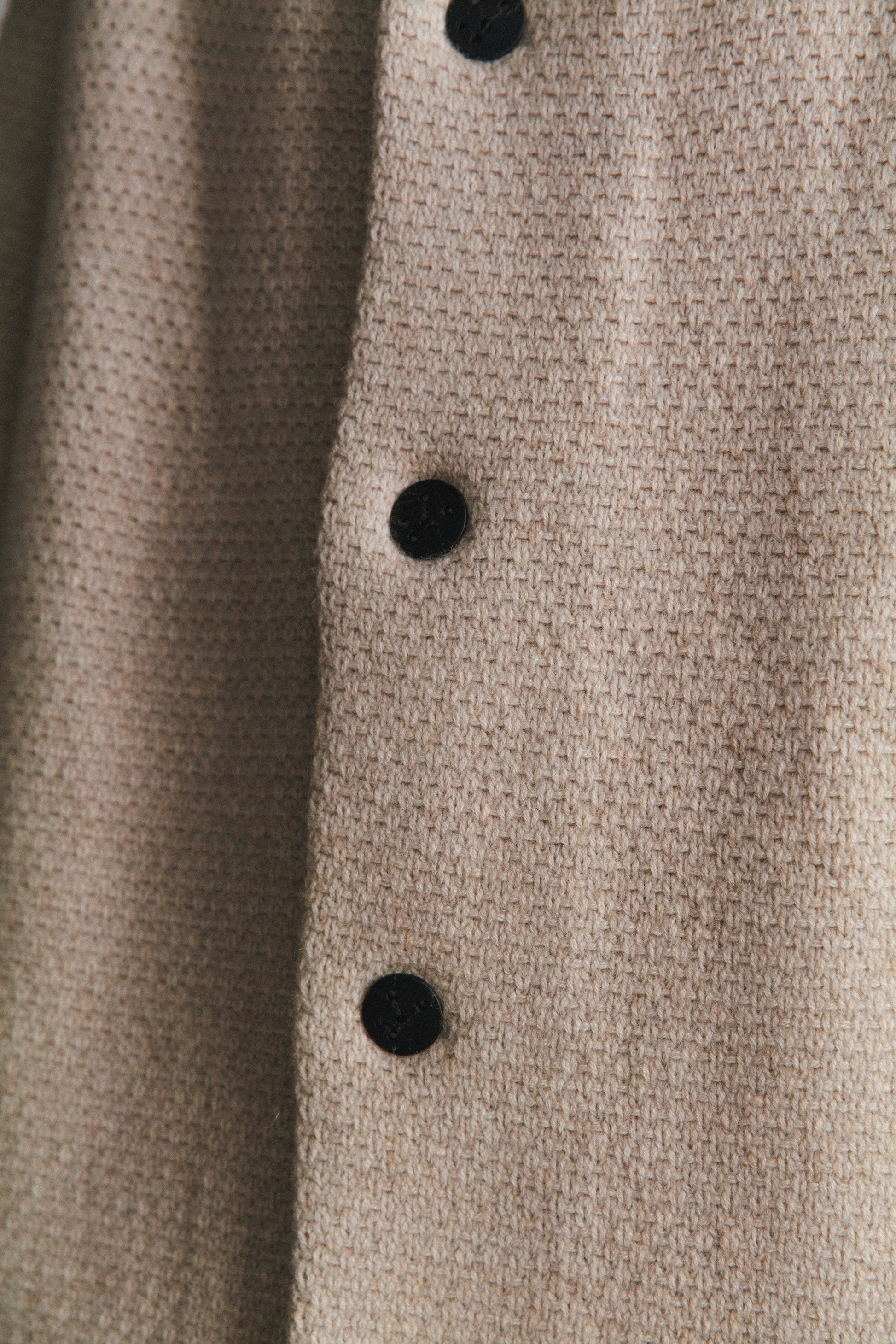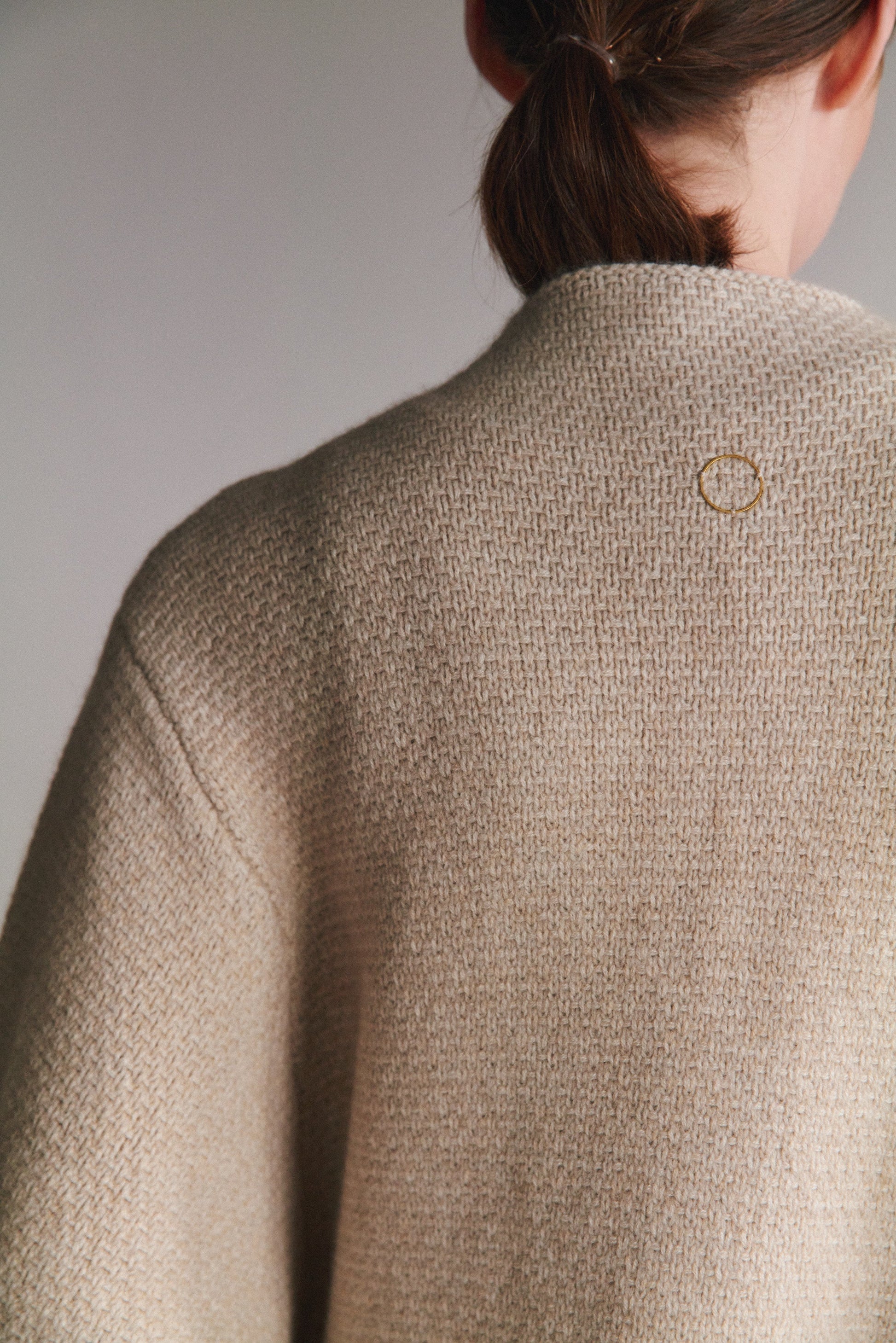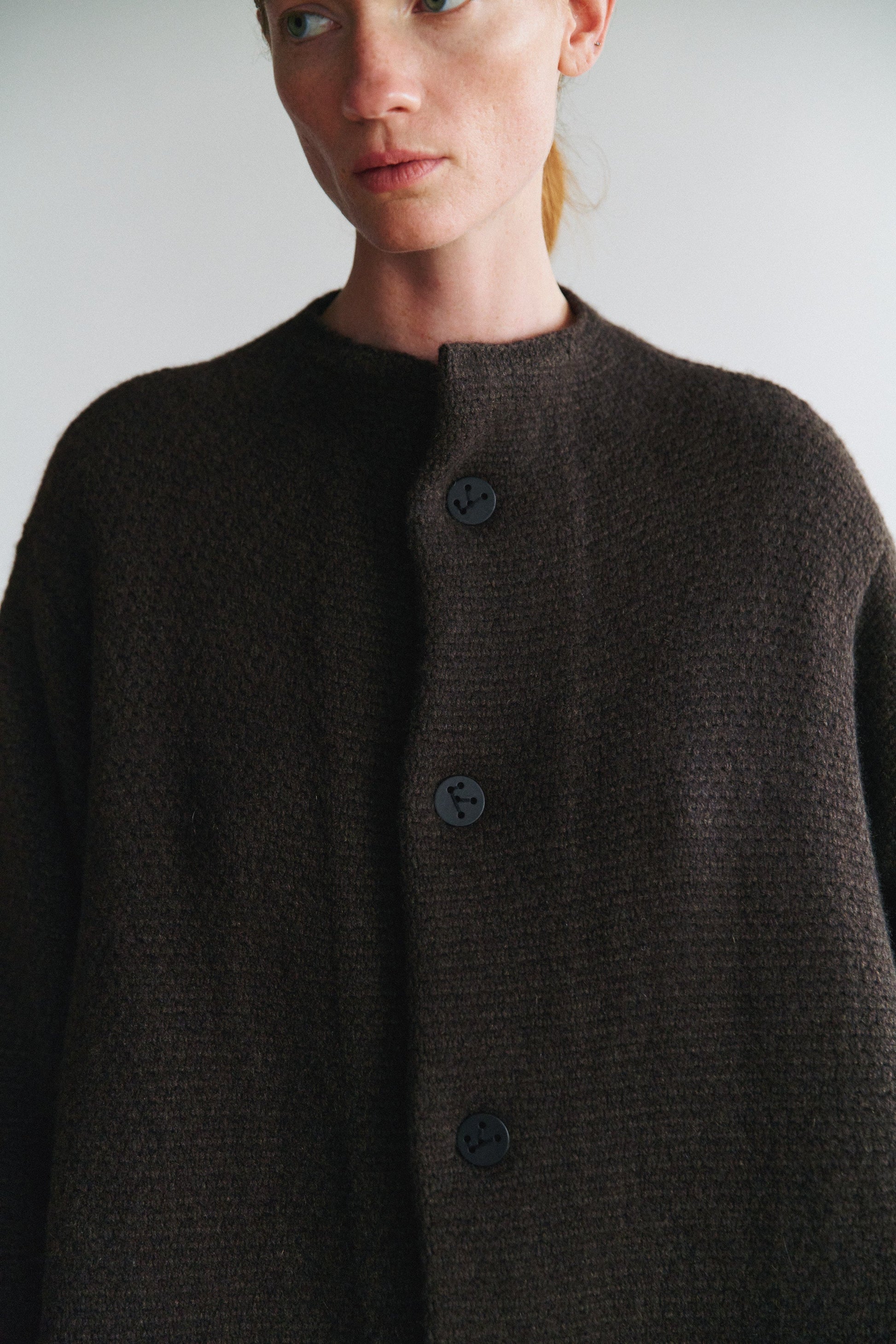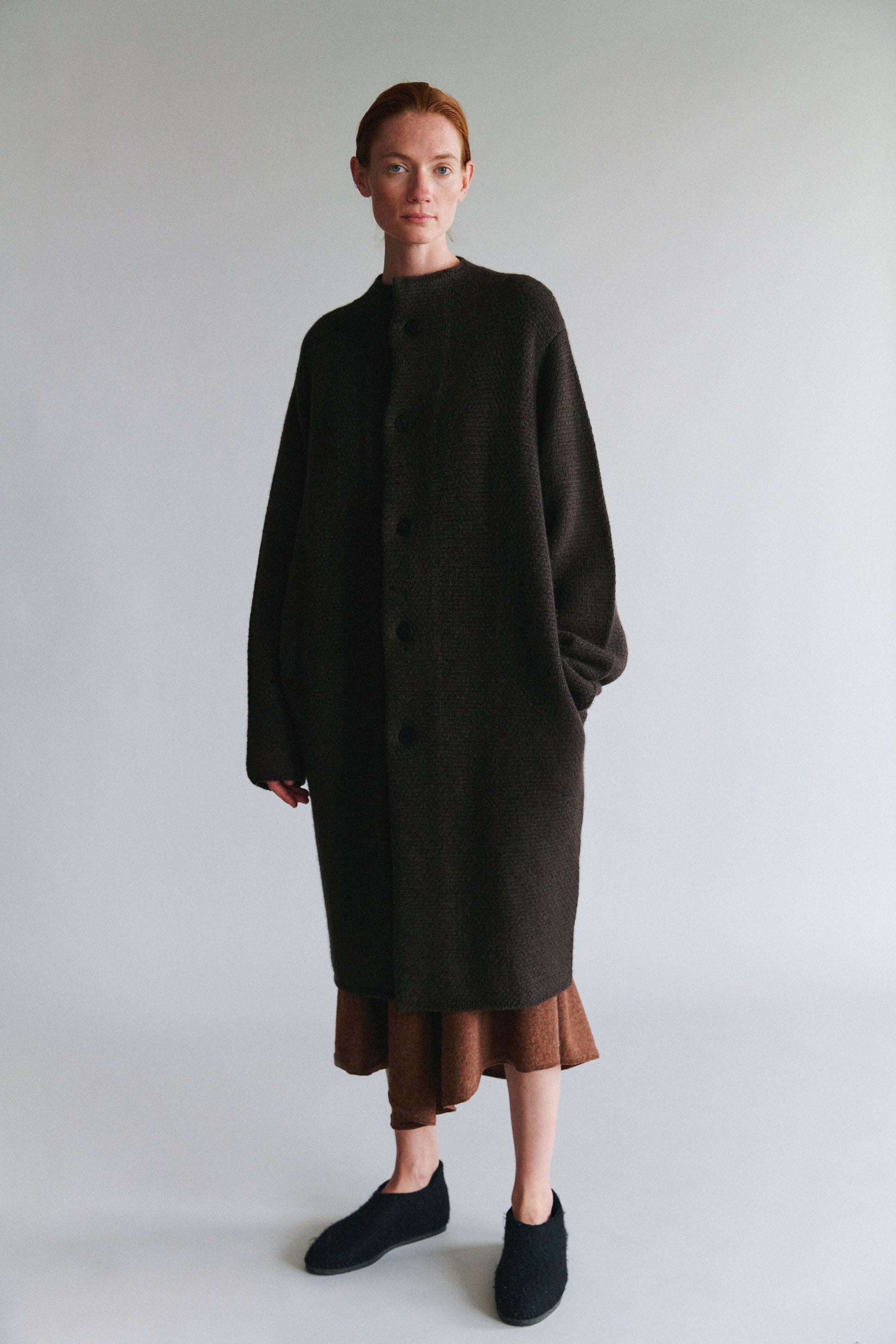 A rich textured chunky knit coat that falls just below the knees. Features dropped shoulders, side seam pockets, and a relaxed silhouette with oversized sleeves.100% Cashmere
