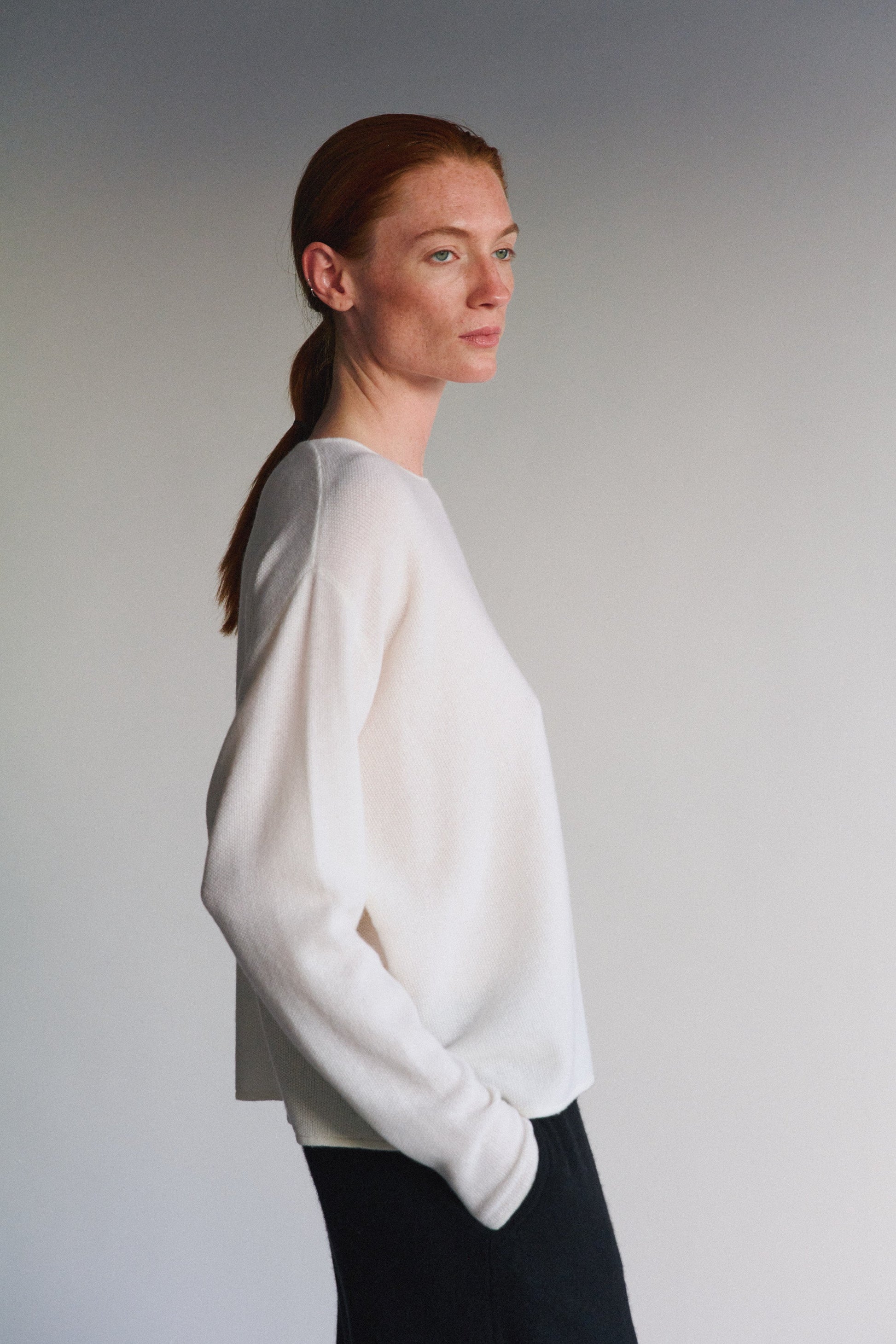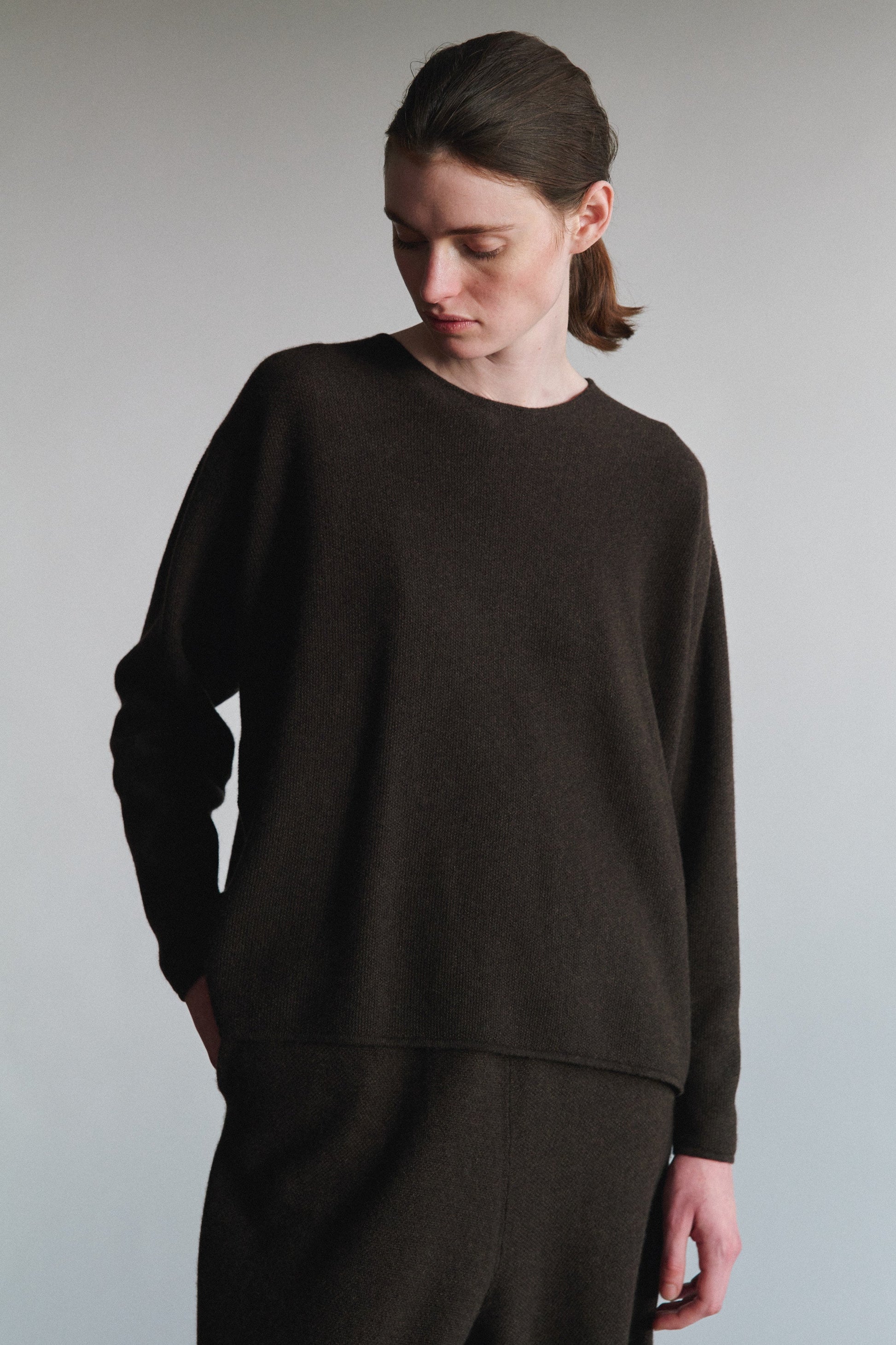 Micro moss knit cropped pullover, featuring a boxy fit and relaxed silhouette. Soft and lightweight, it is an everyday go-to sweater that can be dressed up or down.100% Cashmere