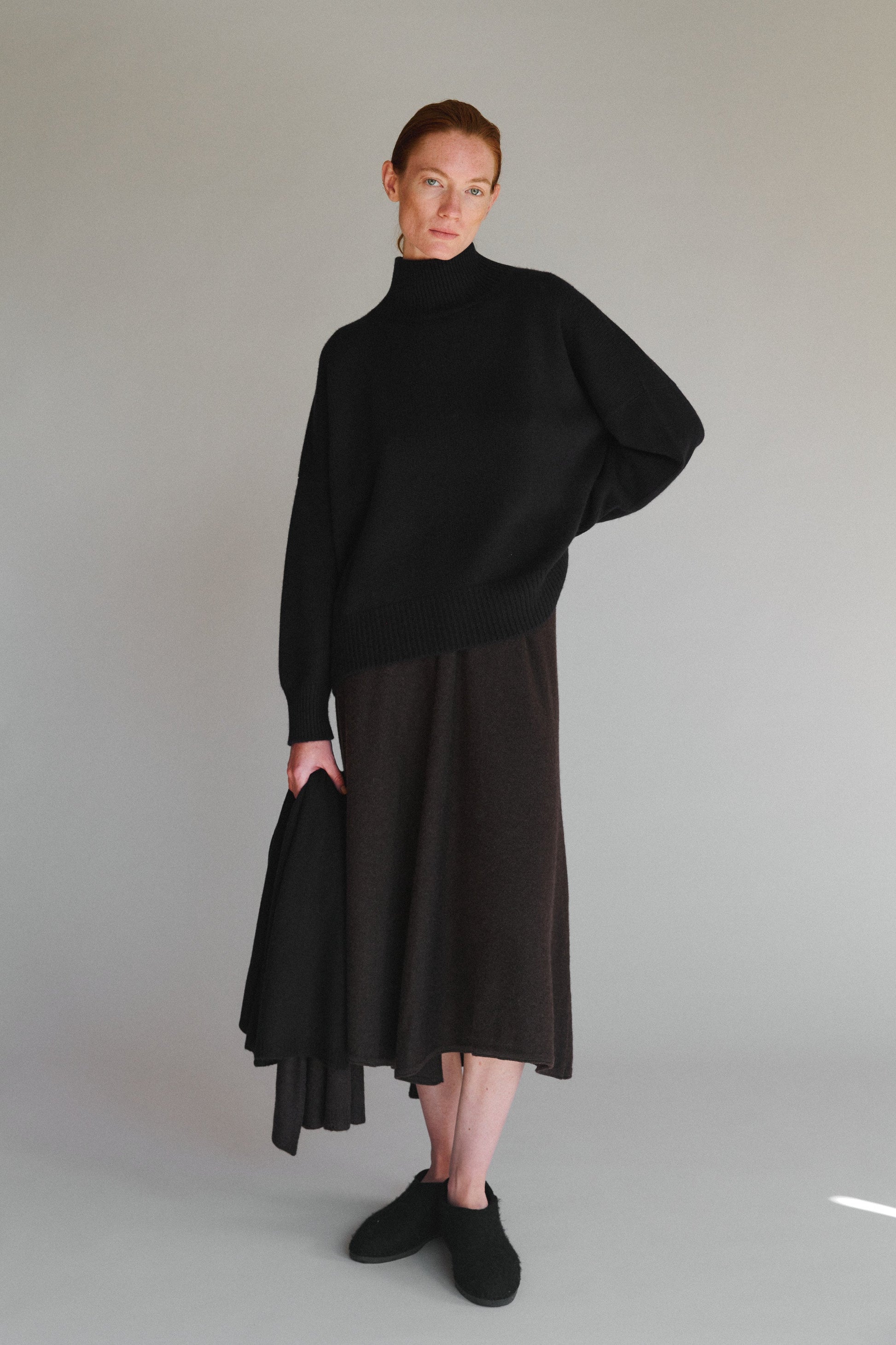 A slightly chunky-knit turtleneck sweater with an oversized fit. The neck envelops softly without any tightness, offering cozy comfort. A timeless winter wardrobe staple.100% Cashmere