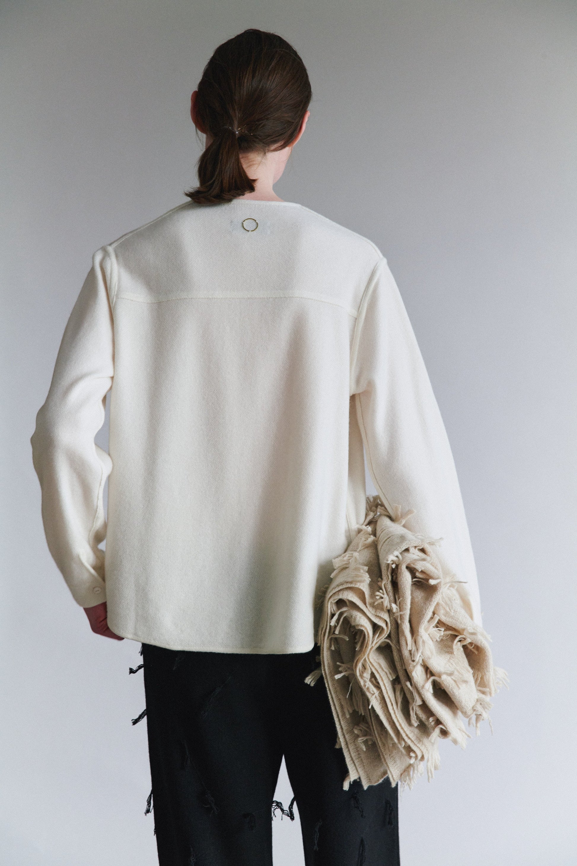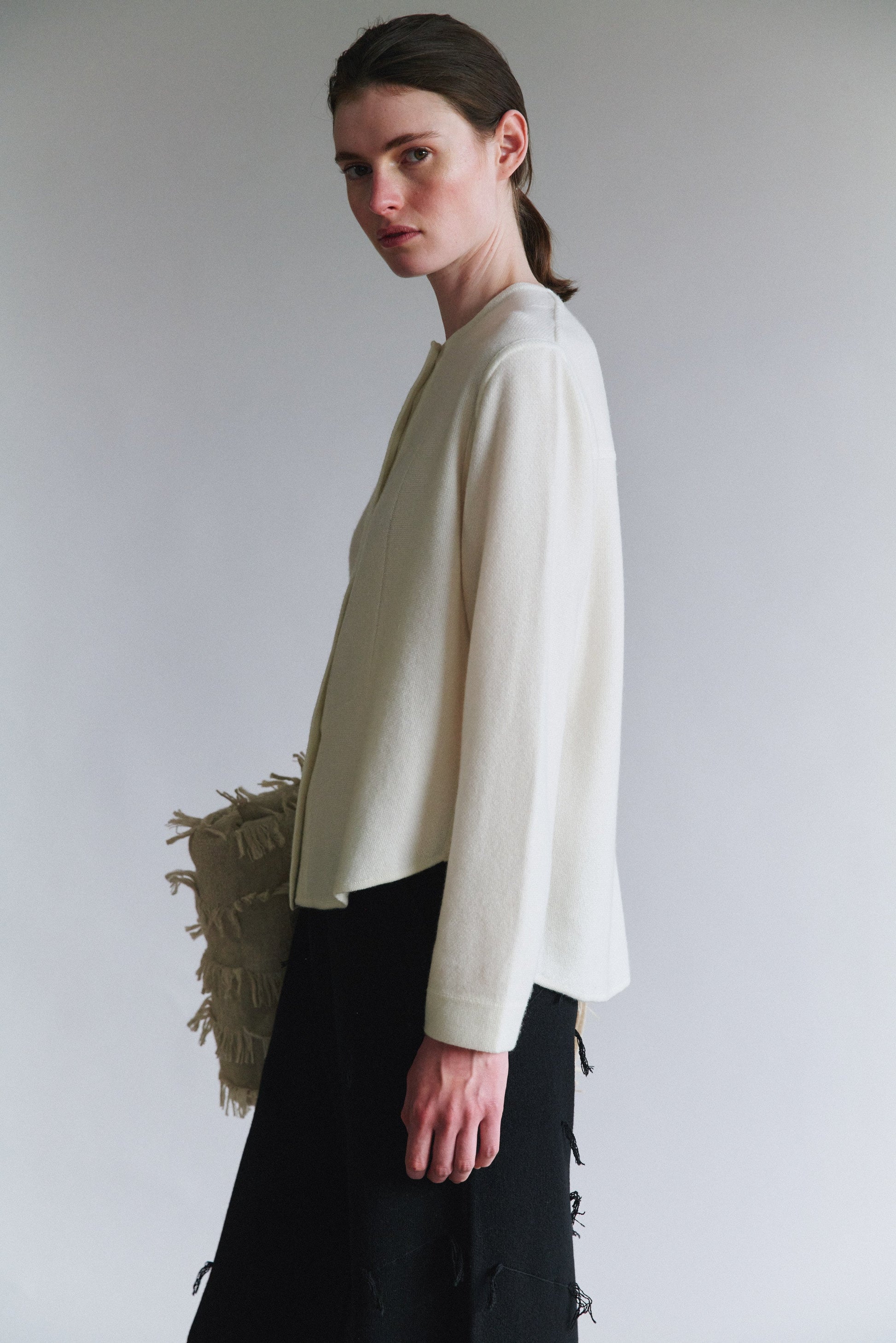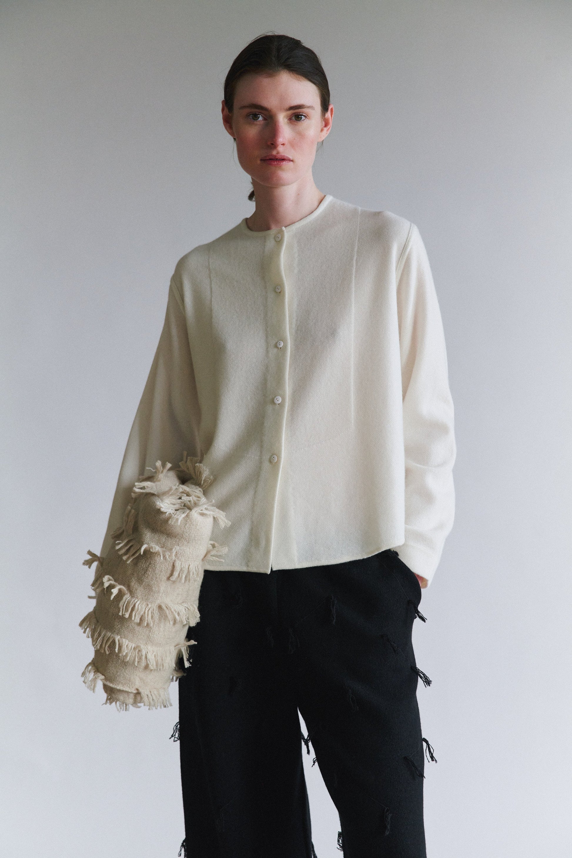 Our cashmere take on a classic tuxedo shirt. This architectural piece is crafted with a half-knit and half-weave technique that stretches where it needs to and maintains its shape where it should. Lightweight yet robust, it can be styled up for evening wear or worn as a casual top for work.100% Cashmere
