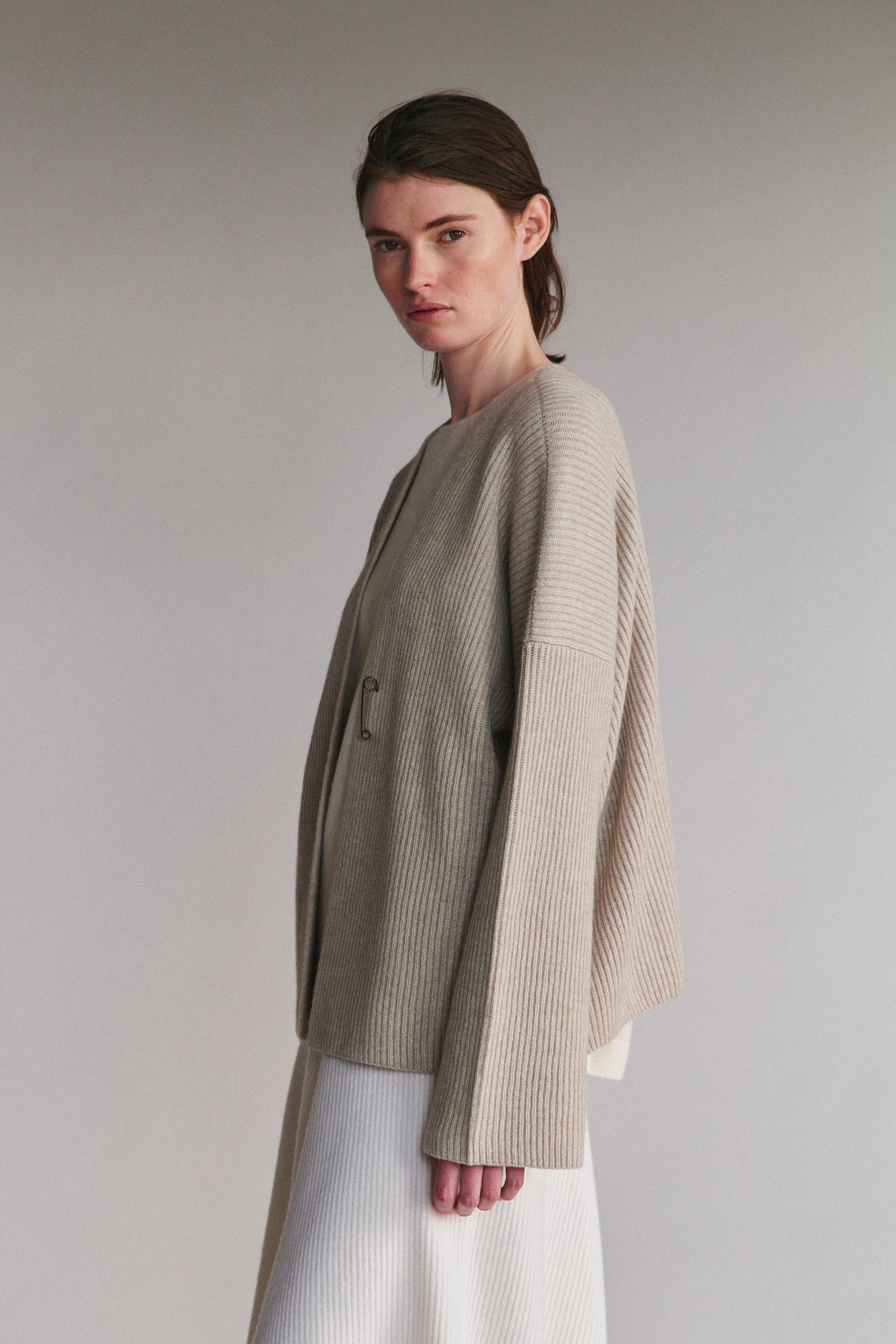 A softly textured rib knit open cardigan constructed with dropped shoulders for a casual, low-key feel that lends itself to timeless layering. Complete with a pin for optional closure.100% Cashmere