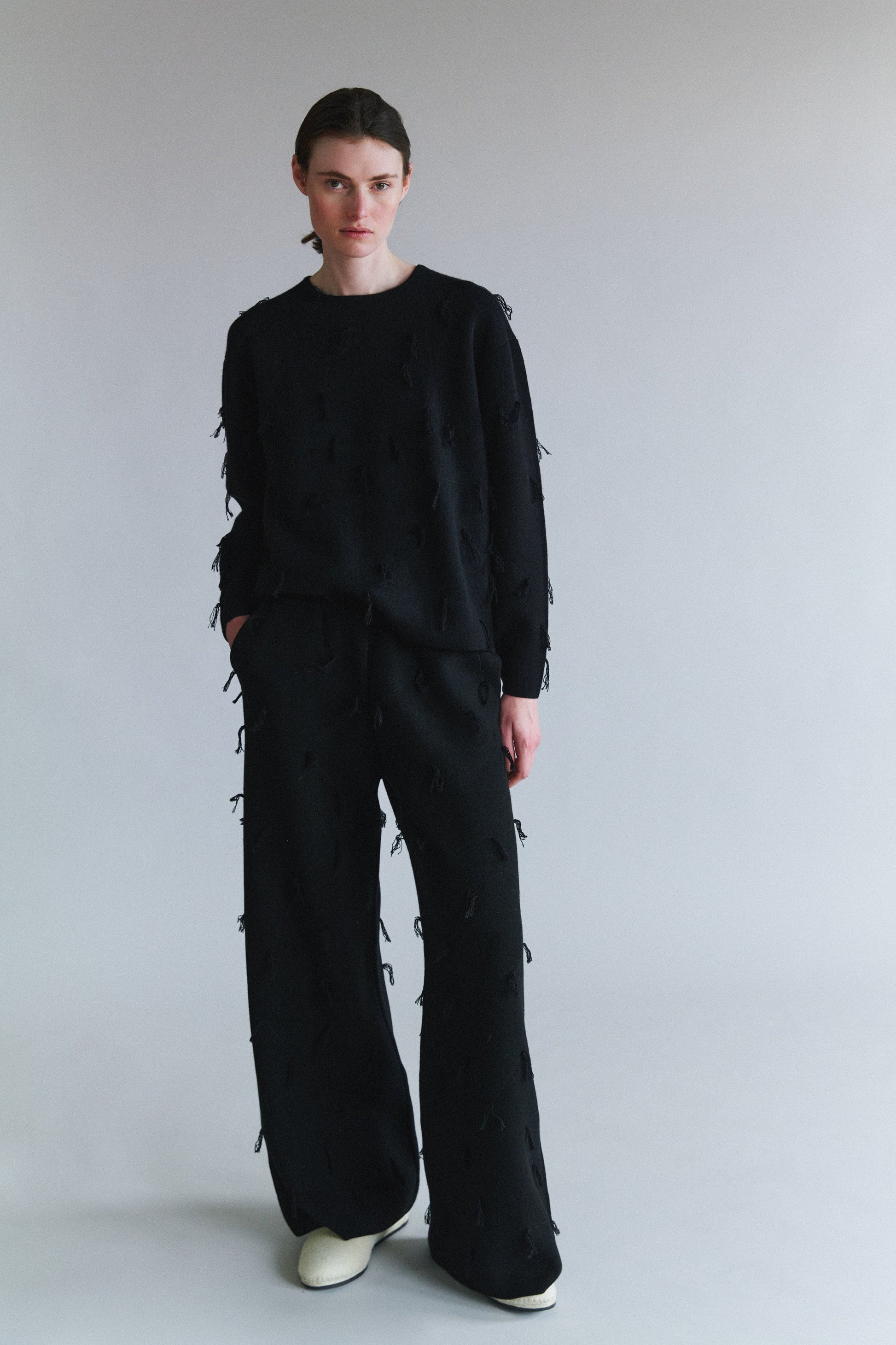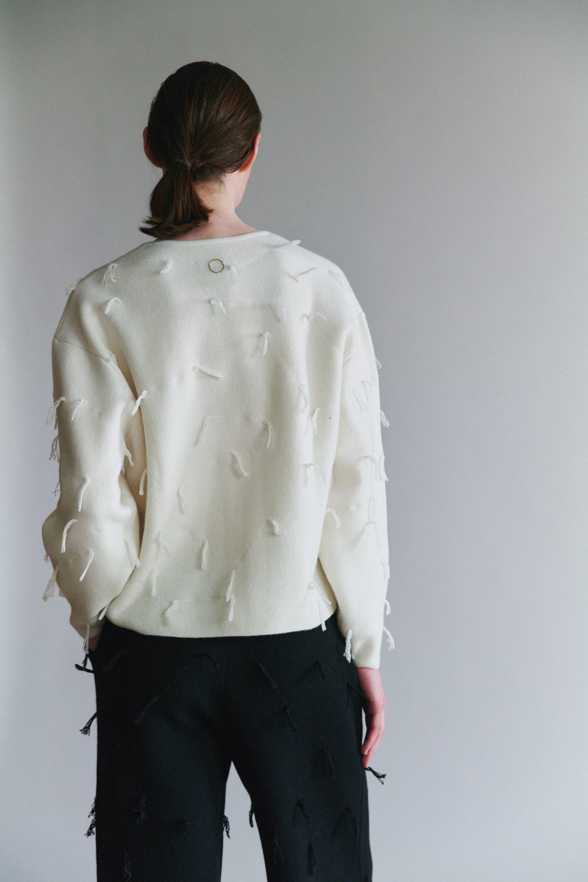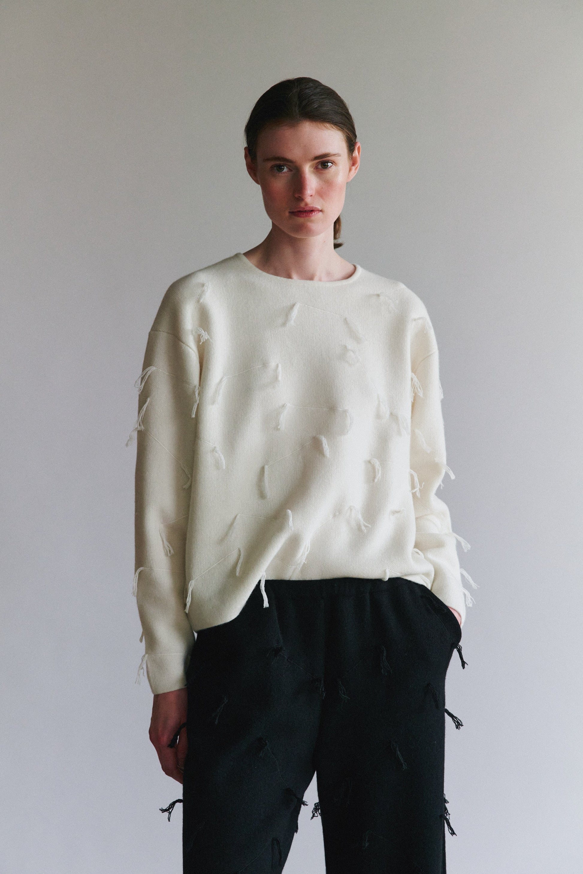 A loose-fit knitted sweater in a structured jacquard stitch. Our signature hand-cut-fringe detail adds a unique dimension.100% Cashmere